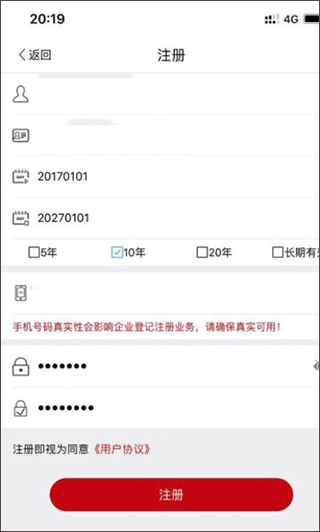 注册时,首先填写基本信息包括姓名、身份证号、身份证生效日期,失效日期,及手机号码、密码。