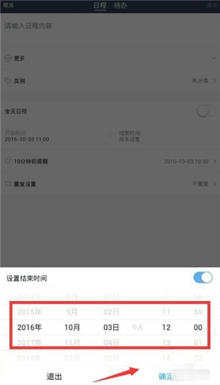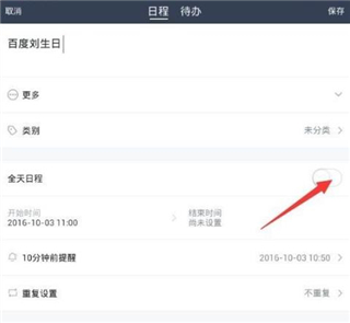 最后我们设置一下提醒的模式,365日历可以设置每天重复提醒功能,而且还可以改为全天性的日程,只要照着图下的位置,将全天日程项目打开就可以了!