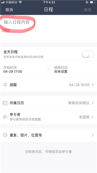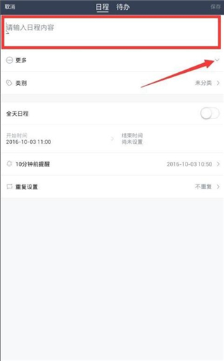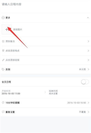 然后,在下图方框中的位置,添加所需提示的内容,这里就不多做介绍了,对于那些愿意用图片表达日程安排的人来说,添加图片的方式更加快捷方便。其实,365日历也是可以添加图片提醒的,这里需点击图上箭头所示的位置!