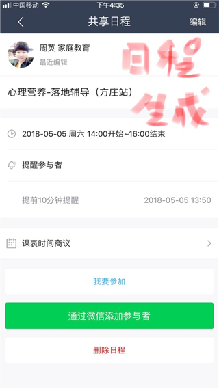 3、共享:多人日程,多人日历,微信邀请,共享联系人,提醒他人