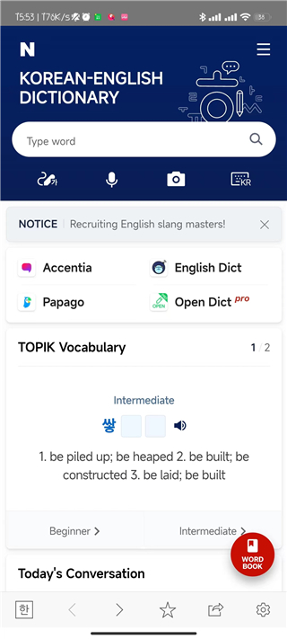 Naver词典app是一款非常专业且强大的手机翻译软件,也是韩国人最常用的词典APP,简约的操作界面,使用起来非常简单。之所以称其强大,是因为这里翻译出来的内容都是根据专业的中韩翻译专家所得来的结果,所以十分具有权威性;之所以说其强大,是因为该平台不仅可以翻译韩语以外,而且还包含了:中文、英语、日语、西班牙语、法语、印度尼西亚、乌兹别克等三十三种语言及其含有272万个词条的知识百科!一个翻译词典让你走遍世界都不怕。此外,Naver词典作为目前国内最好的韩语汉语互译软件之一,它收录了来自韩国最大搜索网址的所有词条资源并进行翻译,用户只要在搜索栏中输入相关的词语就能得到准确的翻译结果,绝对是用户在韩旅游、留学、生活的最佳工具。除此之外:该平台还支持语音识别技术,支持用户进行语音翻译以及文字录入,遇到难写的汉字可以使用综合手写输入器,只要在屏幕上轻划几下,输入器就会自动推送最接近的汉字,而且Naver词典还支持多窗口,无需切入后台就能在当前页面上直接翻译并且能在同一画面同时开启各种应用,省时省力,让用户随时随地进行翻译,足以满足那些对学习韩语有需求的朋友们的条件,为便于国人们使用,小编特意在下文奉上了设置中文教程,亲测有效,有需要的朋友们欢迎前来下载体验。