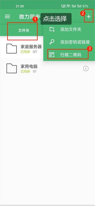 2、在手机端上,点击“文件夹”——点击右上角的“+”——选择“扫描二维码”
