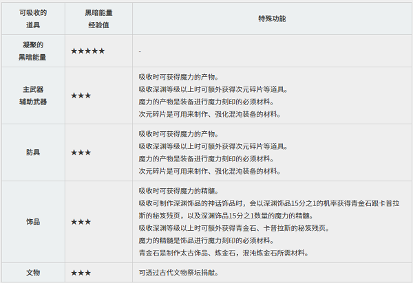 可以透过吸收装备、饰品、文物等物品获得所需经验值,凝聚的黑暗能量是黑精灵专用的成长物品并可提供相当多的经验值,