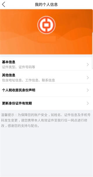 1.用户登陆成功后,点击“我的”后,再点击“我的个人信息”下的“更新身份证有效期”进入个人身份证更新页面。