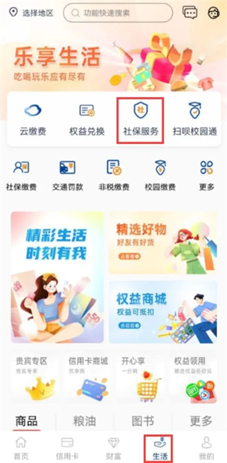 1.登录手机银行,在“生活”板块点击“社保服务”菜单。
