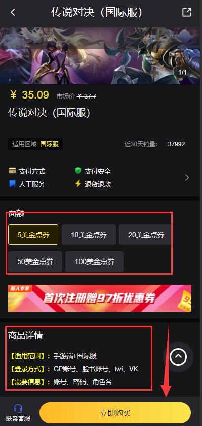 第三步:选定充值面额,并仔细阅读底部注意事项后,在点击立即购买。
