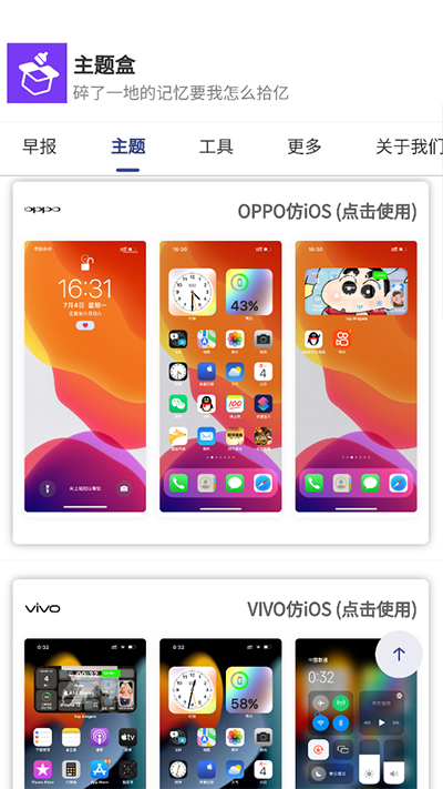 1、首先打开主题盒app,在首页我们可以看到很多的手机型号仿ios的主题可以使用;