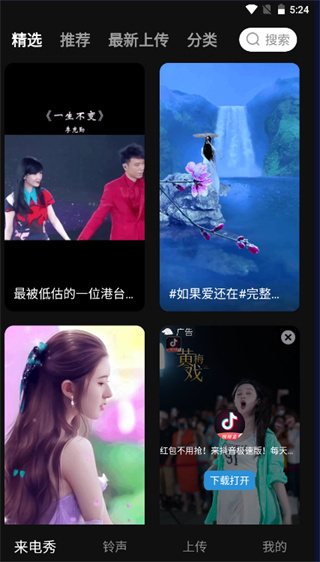 来电视频铃声app是一款手机视频来电秀软件,软件内拥有着海量铃声,短信闹铃,搞笑另类,网络名曲资源等。超多热门铃声,经典歌曲等资源可以任你更换,让你知晓更多来电秀。还可快速找到你想要的视频壁纸,动态来电视频主题,一键设置,方便快捷。拥有着自定义手机来电视频铃声功能,让你的电话更炫酷。这里不仅有你想要的铃声,还有你喜欢听的铃声,感兴趣的快来下载看看吧!