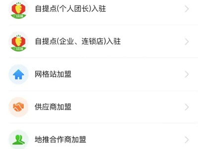 4、点击之后可以看到有“自提点(个人团长)入驻”“自提点(企业、连锁店)入驻”“网格站加盟”等,选择“自提点(个人团长)入驻”,之后会跳转到微信;