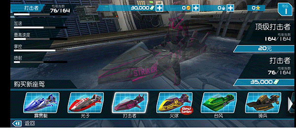 最让我觉得有意思的是游戏里的快艇种类,从入门的霹雳艇到终极的霸王龙,每种快艇的性能都不一样,价格也挺高的,得通过比赛积累钞票才能解锁更高级的船。而且还能给快艇喷图、贴花,个性化十足。