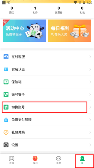 5、进入“我”页面,点击“切换账号”,添加或注册其他账号即可切换成功