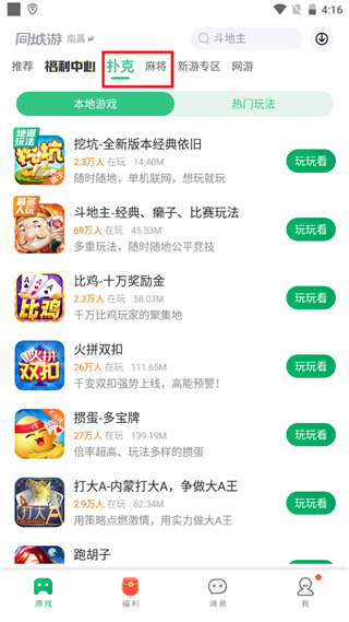 3、在“扑克/麻将”页面,不仅有当地的本地游戏,还可以选择当下热门的玩法开启游戏