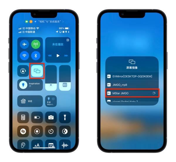 手机下拉控制中心,选择【屏幕镜像】即可(这里要选择在EV投屏TV版显示的【本机名称】,依照上图选择「MStar JMGO」)。