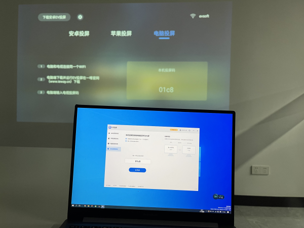 下图为电脑连接方式。将「EV投屏TV端」切换至电脑投屏页面,记住「本机投屏码」