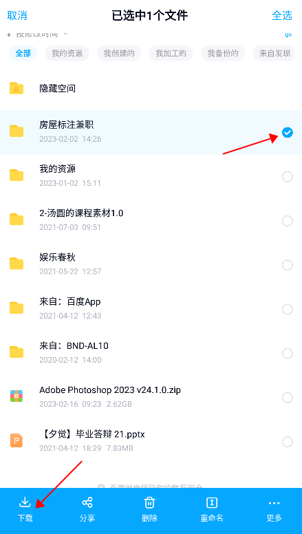2、登入后,会出现你以前保存的所有文件,选择你需要下载的文件(在右边的圆圈里打√即可),然后点击左下角的下载。
