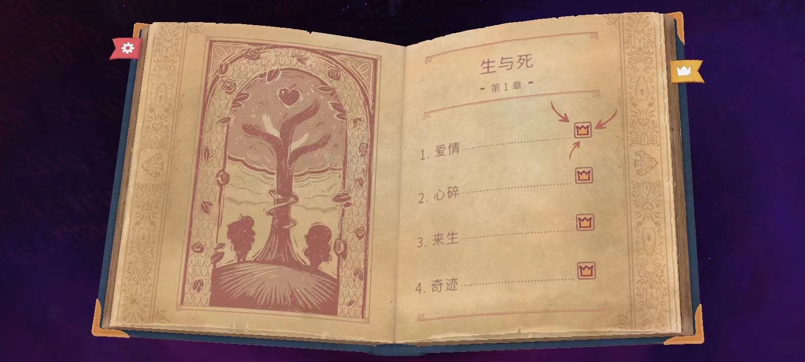1、首先,玩家进入游戏后,会进入第一章生与死,一章又会分为很多小节,当旁边的方框中出现皇冠的时候,意味着通关成功;