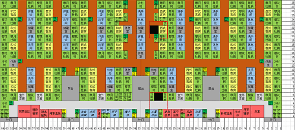 2、布局图上半部分的中间是“商业区”,每种设施只用一个,实现所有的契合度组合。没有契合度组合的设施也放置在了这里。两边是男女温泉区,放置了所有四种温泉,并且实现了每个温泉都有除了异性加成之外的六种温泉功效(例如男性的温泉没有花瓣之池和盐之池这俩增加女性契合度的功效)。
