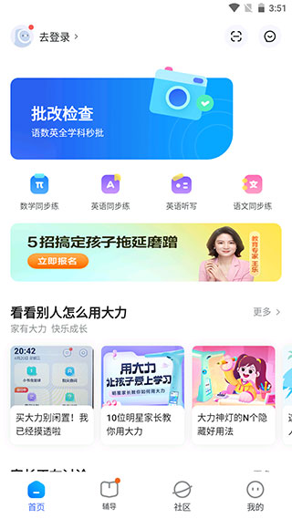 父母工作太忙没时间辅导功课?孩子复习找不到重点?字词发音不标准?这些统统都可以来大力家长拍照搜题软件解决呀。这是一款帮助家长智能辅导宝贝学习、帮助宝贝提升自主学习能力的工具类软件,也是家长们交流教育经验、分享学习理念的平台。父母没时间辅导,它可以智能辅导,助力家长辅导宝贝学习,激发学习兴趣,让家长省时更省心。复习没重点,它有高效练习,智能记录错题,同步生成习题。让孩子举一反三高效学习,考前复习事半功倍。并且还有难点解析,口算题提供趣味讲解,提升孩子学习兴趣。复杂题提供专业老师视频精讲,在家也能享受专业辅导。是家长的好助手,孩子的好帮手。