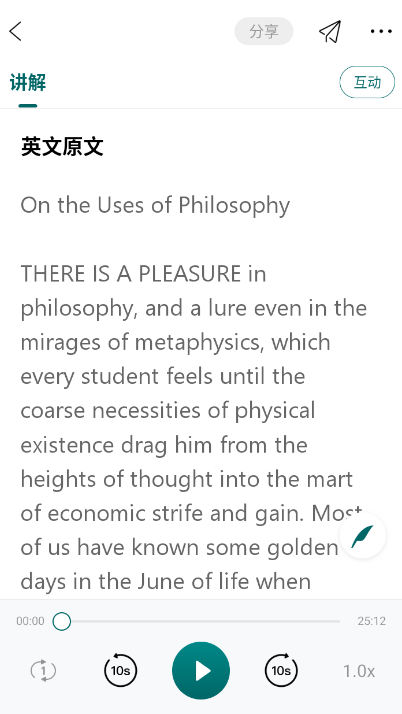 友邻优课app是一款高效便捷的英语学习软件,提倡“不功利”地学英文,不为学习英语而学英语,而是利用经典诗歌、原版书籍、哲学、外媒新闻等时下最鲜活的素材来学习英文,让你真正体会英文乐趣的同时收获知识,在潜移默化中不断提升英语能力。同时,友邻优课上还拥有各种不同程度级别的课程讲师,包含四六级资深导师、桥大学语言学博士、雅思考官等,学习范围涵盖生活、职场、哲学、文学等多方面,适用于不同的人群。友邻济济,优课云集,不孤独的学习者都在友邻优课学习英语!