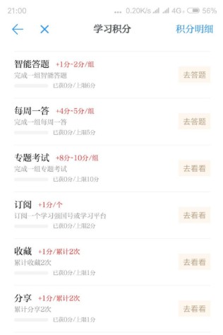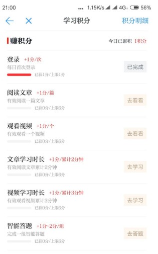 2、在学习积分中,有许多的学习增长得积分方式,比如我们看文章和视频,具体方式如这两张图,我们可以点击旁边的去看看等提示就可以进行增长积分途径;