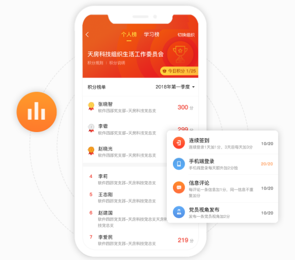 党组织搭建积分体系,通过排名的方式鼓励党员学习、分享、互动,调动党员的积极性。