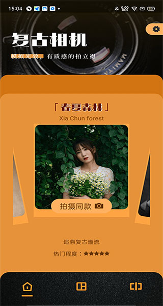 1、打开软件后,用户可以选择拍摄同款,提供了古典之韵、旅行、漫画印象、街头韵味、中华照相馆、春夏森林、黑与白、光效斑点等风格;