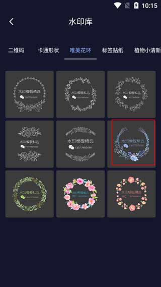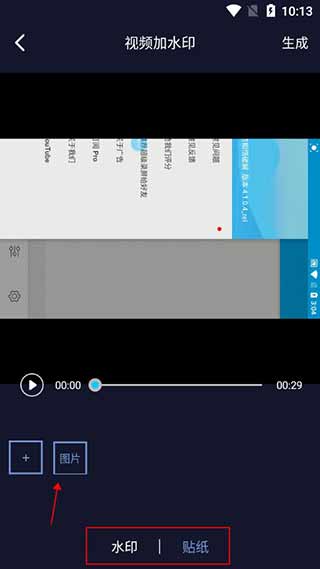 3、在界面下方选择水印或者贴纸,然后点击加号添加软件附带水印,点击图片则是手机上已有的图片;