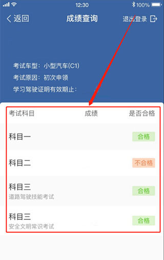 5、登录之后,会跳转到成绩页面,显示以往考试记录的成绩。