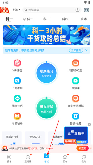 1、打开手机上的APP,把底部导航栏切换到“考试”的页面