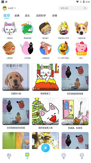 2、为大家带来了听读看,在听中可以听海量故事内容,其中有故事、儿歌、动画片、国学、英语等等;
