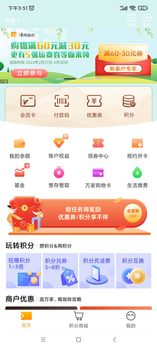 2、进入软件,在首页,有会员卡、付款码、优惠券、积分等,下方还可以查看余额、账户权益基金等;