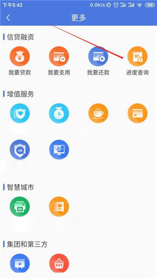 4、贷款申请成功后,在应用程序首页的更多功能菜单中找到进度查询,查看自己申请的进度