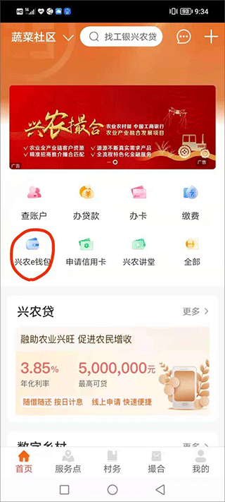 1、打开并登入app,进入首页中点击“兴农e钱包”
