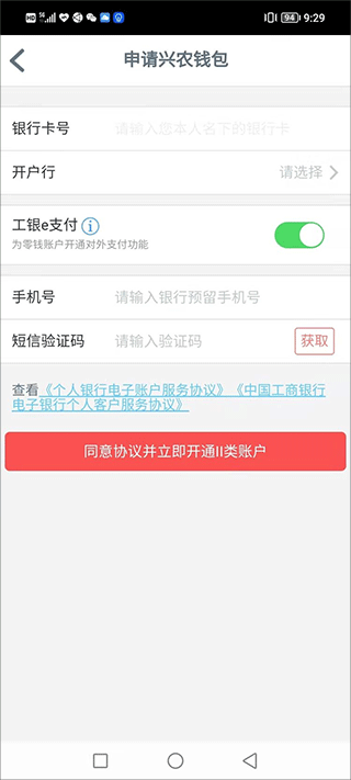 4、输入一张一类卡卡号,以及相关信息,获取验证码并输入后,点击下方“同意协议并立即开通二类账户”