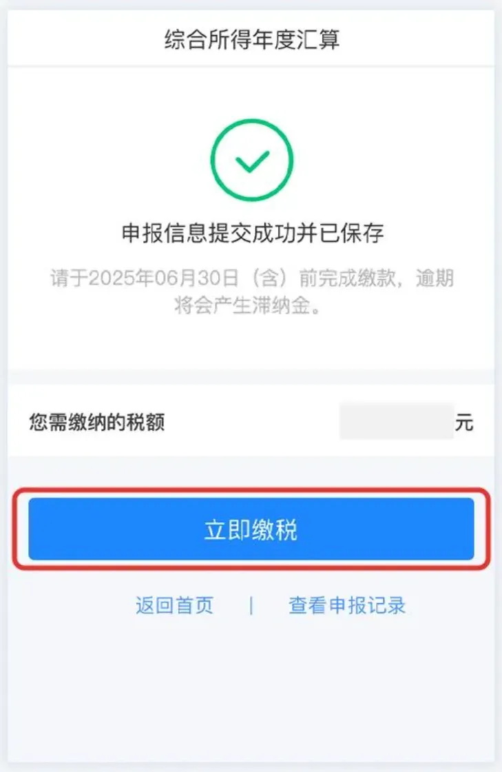 (三)如需要补缴税款,则跳转到缴税页面,点击【立即缴税】,选择缴税方式后点击【确定】。