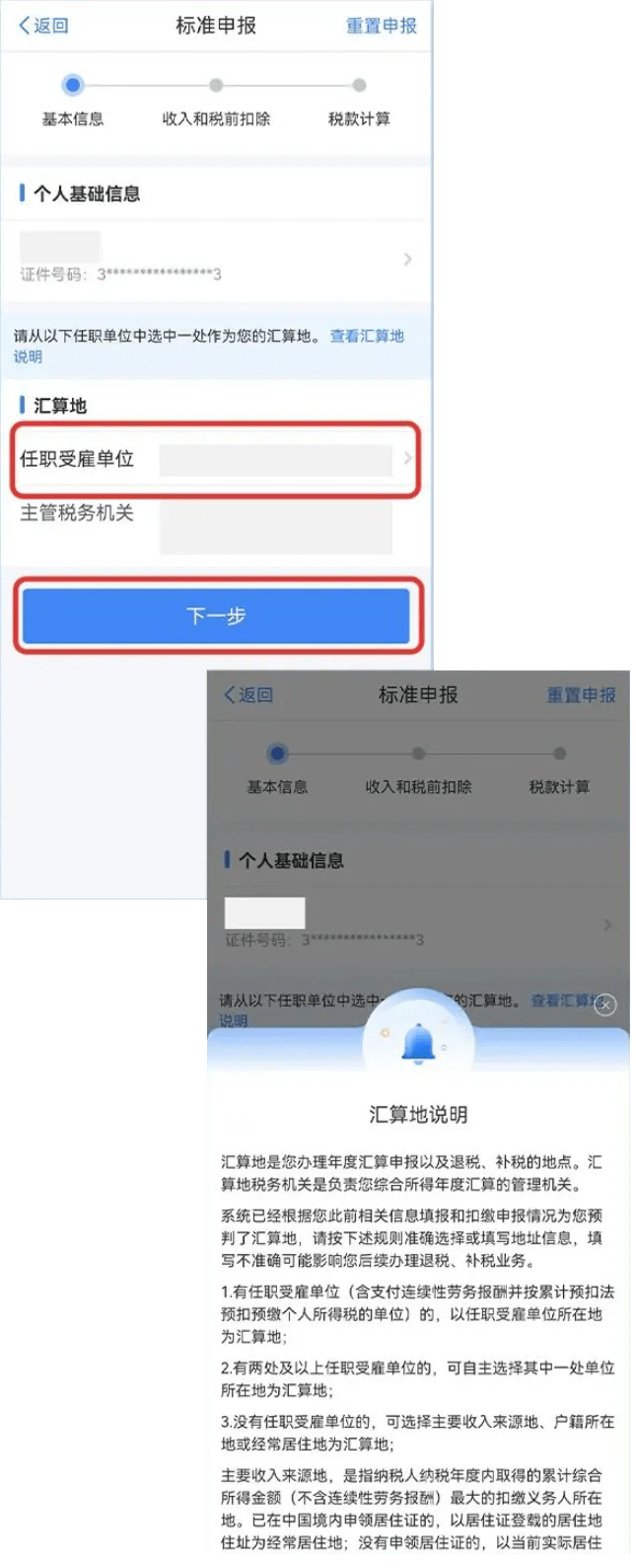 (一)进入基本信息界面,核对【个人基础信息】,选择或确认【任职受雇单位】,点击【下一步】。