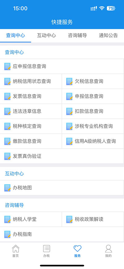 1、打开移动办税APP,在【服务】页面滑动到“查询中心”部分;