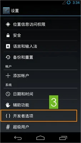 3、如果手机没有root权限时,请打开手机的系统设置,选择「开发人员选项」,将「允许模拟地点」设置为开启状态。