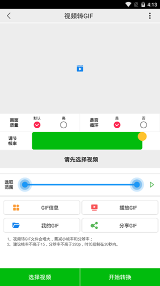 视频GIF是一款专门运用于视频GIF 制作的视频、图片编辑制作工具软件。GIF文件,我相信大家肯定在许多的社交软件上有所遇见,它藏身与我们的表情包当中,短视频当中,现在的GIF图片对于现在的我们来说是非常常见的了,但是相信大家一定知道,制作这样的图片,一般的软件是无法制作的,更遑论在手机上了。而小编现在所推荐的这款软件就充分的满足了大家的需求,即使在手机是哪个用户也可进行视频的GIF转换,极大的方便了用户的使用,该软件操作简单,处理速度也很快,可以快速打开图片,视频,自由的进行编辑操作。软件中的功能也是十分多,可以帮助大家快速的将视频转换成为GIF图片,并且还可以批量操作处理,一键完成你需要的操作编辑,完美的支持AVI, MPEG, MP4, WMV, MKV, MOV, VOB, RMVB等格式。可谓是转换GIF 文件的好帮手,有了它,用户在也不需要使用繁杂的电脑修图软件了,在掌上就可以轻松完成对图片、视频的编辑。如有需要快来下载吧。