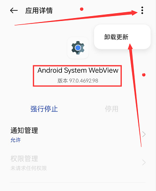 1、 Android System WebView 版本需要101以下版本,如果之前升级过可以到应用管理卸载更新(卸载更新后需重启手机)。