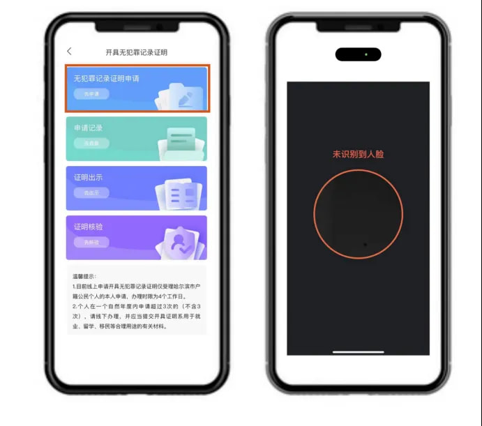 3.在“上新服务”栏目中选择“无犯罪记录证明”开始申请,进行人脸识别。