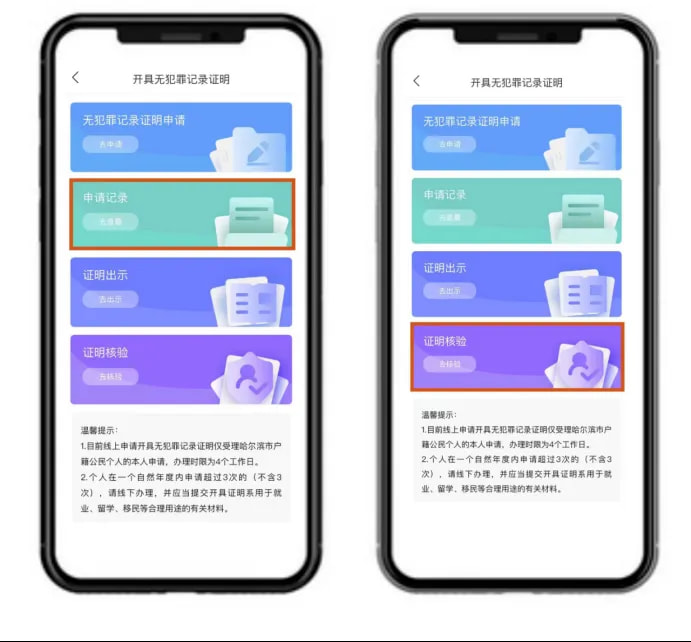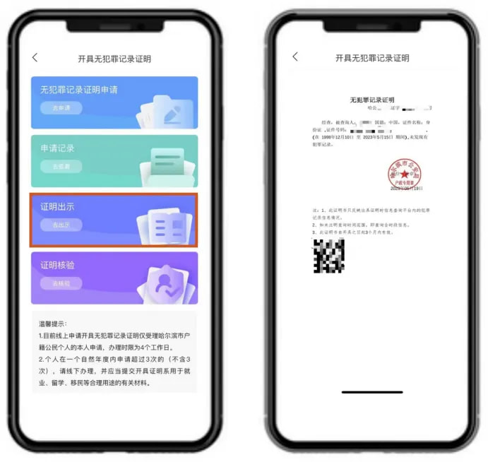 6.进入申请记录模块可查询办理进度。点击“无犯罪记录证明”证明核验页面,扫描“无犯罪记录证明”上的二维码,可显示相同的证明内容,方便使用部门、单位等进行相关证明的核验。