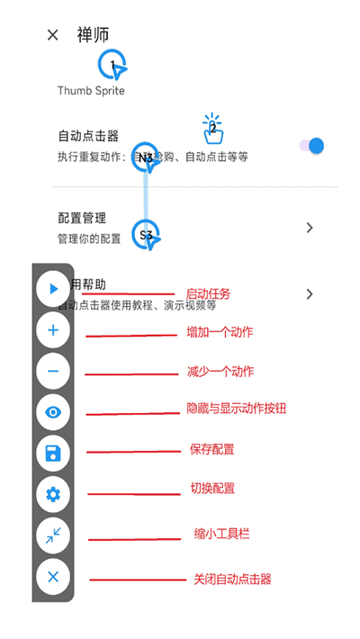 2、操作栏与点击按钮是可以触摸拖动的,下图是工具栏的详细介绍