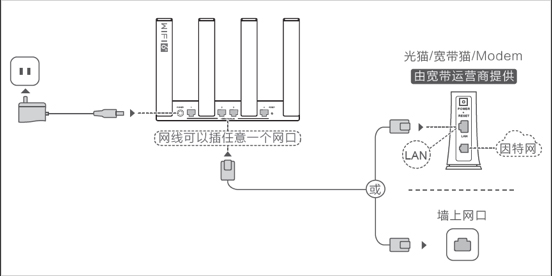 将路由器接通电源;用网线将路由器的 WAN 口连接到因特网(如宽带猫、光猫、入户网口等)。