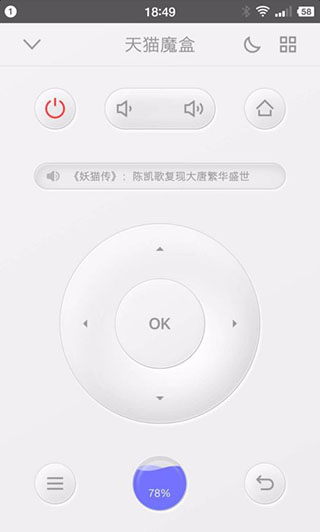 安装完毕之后,手机上重新连接阿里云盒子,这时候能够顺利连接了。打开界面后,有很多功能,如果需要使用遥控,点击底部中间的蓝色按钮,便进入到遥控器界面了。遥控器的使用很简单,完全模拟实物遥控器。