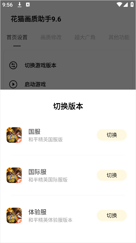1、在本站下载安装花猫画质助手9.6正式版后,玩家可以通过软件首页进入设置,使用切换游戏版本、启动游戏、修复闪退、以及一键恢复画质等便捷功能。