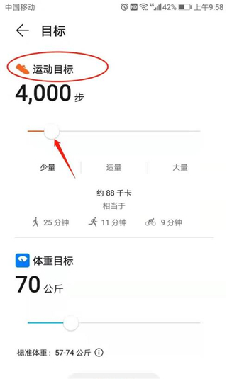 4、在目标页面,拖动【运动目标】的滑块,设置运动目标步数。