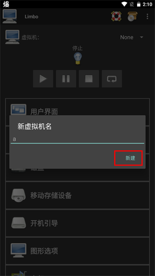 9、这里当你点击磁盘A后面的None时,会弹出小窗口,这里要选择打开而不是New。New是新建一个空镜像,而打开则是手机自带或者limbo内置的文件管理器,让你选择镜像。