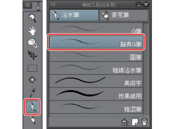 ⑤从[工具]面板中选择[沾水笔]工具,再在[辅助工具]面板上点选[G笔]。