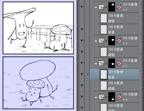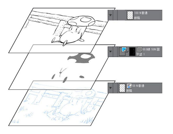 在绘制漫画的过程中,则是在这些图层的上面一边进行作业一边追加图层,像是「分格边框」和「描线」、「黑底・网点」等等。